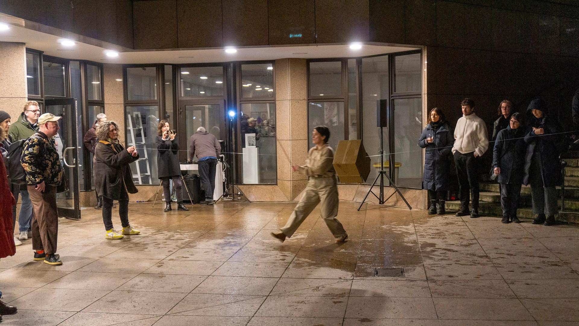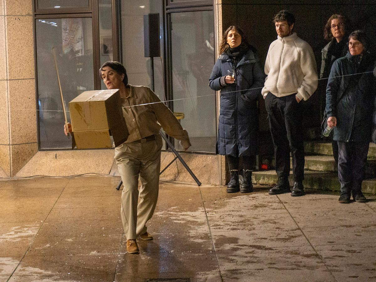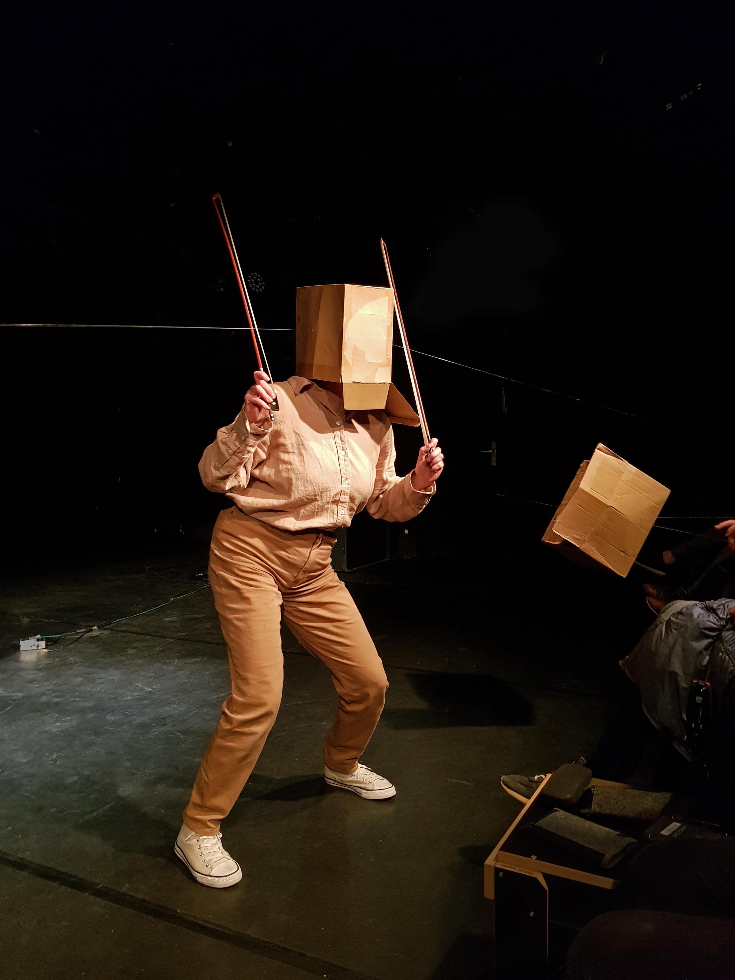 “on the fly” is a performative sound sculpture that can be spontaneously created anywhere. Steffi Weismann adapts the work to the specific location and situation, and it can be performed as a solo, duo, or trio. The audience is often involved as well. The nylon strings, ranging from 2 to 6 meters in length, are partly secured to anchor points and partly stretched by hand. This creates variable pitches and opportunities for interaction. The resonance is transmitted from the cardboard via wireless microphones to one or two speakers. The result is a soundscape of flowing string sounds rich in overtones and multiphonics. Within this three-dimensional network of lines and floating cardboard boxes, the performer plays with one or two bows while standing, lying down, or sitting. Her body partially merges with the installation in a cyborg-like manner when she places her head inside a floating box, and her voice also becomes part of the soundscape. The performance remains abstract, yet creates many possibilities for association and becomes part of the environment. Perception is heightened, as if time were stretched and space expanded.