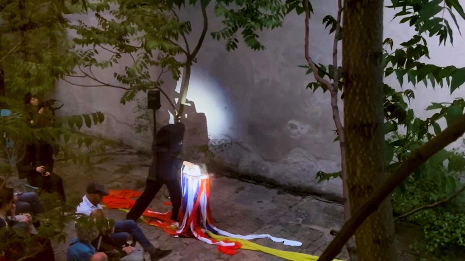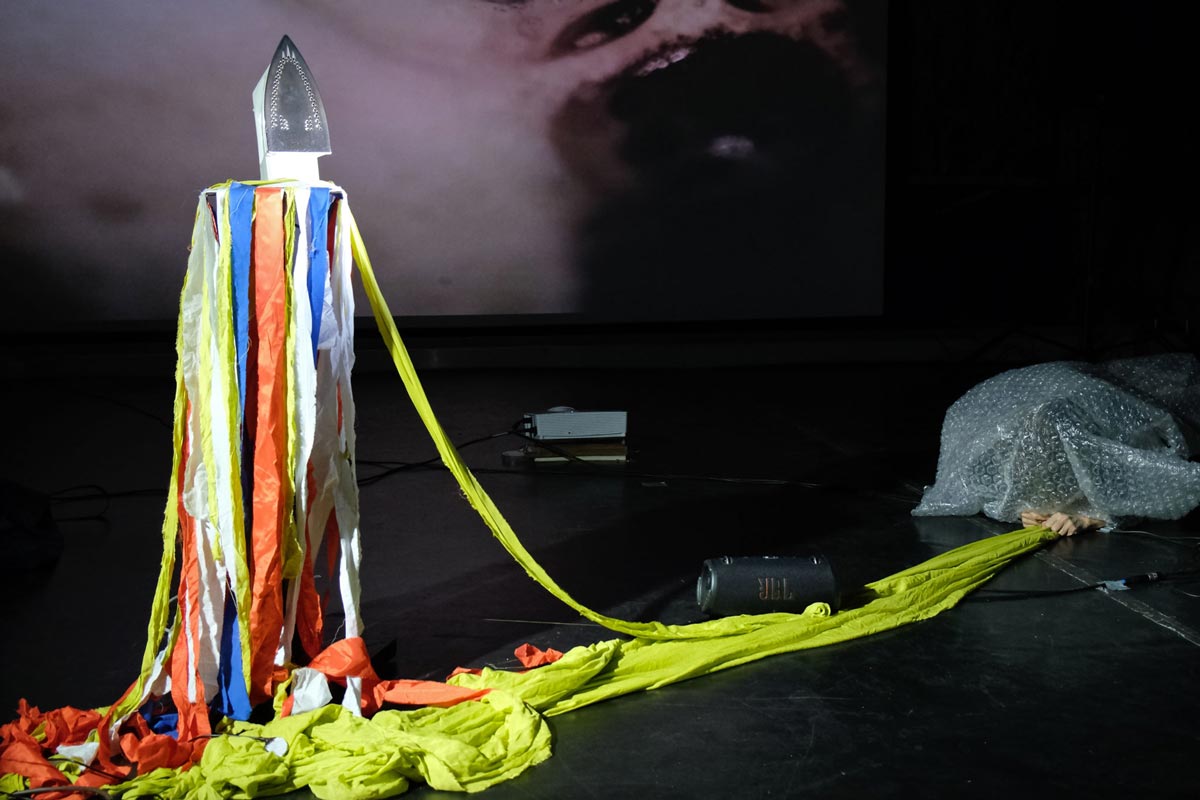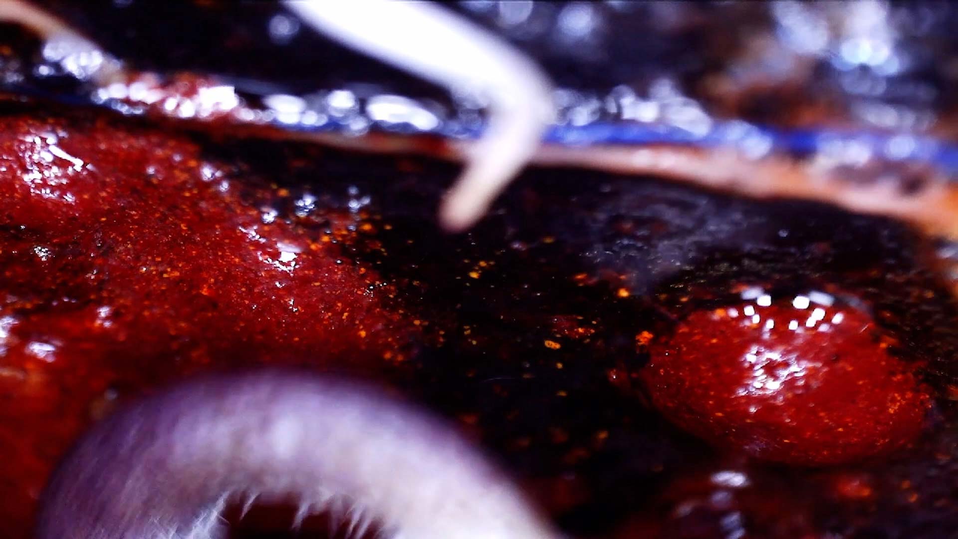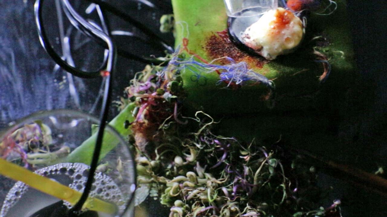 audiovisual performance by Annette Krebs and Steffi Weismann for amplified objects, voice and live-electronics, fabrics, iron, sprouts, red jelly, metals, foam, bubble wrap, microscope and video projection (27 Min, 2024)