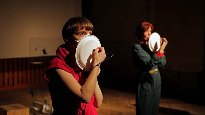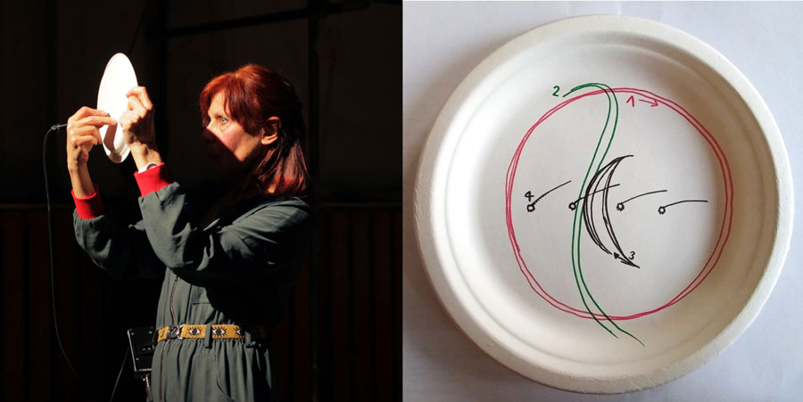PLATOPHONICS Quartett für Teller aus Zuckerrohr, Stiftmikrophone und quadrophone Live-Elektronik (7', 2021) Komposition: Steffi Weismann, Co-Programmierung in MaxMsp: Annette Krebs, UA: 18.6.2021 im Rahmen von "A oder B", Maulwerker und Gäste, Ballhaus Ost, BerlinDie grafische Partitur von platophonics geht auf Studien von René Decartes aus dem 17. Jahrhundert zurück, der in seinen Zeichnungen, die erstaunlichen Verbindungen zwischen Auge und Gehirn visualisierte. Auf vier runden Scheiben werden Linien gezeichnet, die sich akustisch über vier Lautsprecher verräumlichen. Die Linien wandern quasi von der Fläche in den Raum und werden live-elektronisch über die Klangregie bewegt. Verbindungen von Auge und Ohr werden stimuliert und lassen fein variierte Tonhöhen im Rauschen der gezeichneten Schleifen heraushören. Die Klänge entstehen aus einem Zusammenspiel von Material, Fingernägeln und speziellen Stiftmikrophonen. Das Stück hat einen meditativen Charakter.